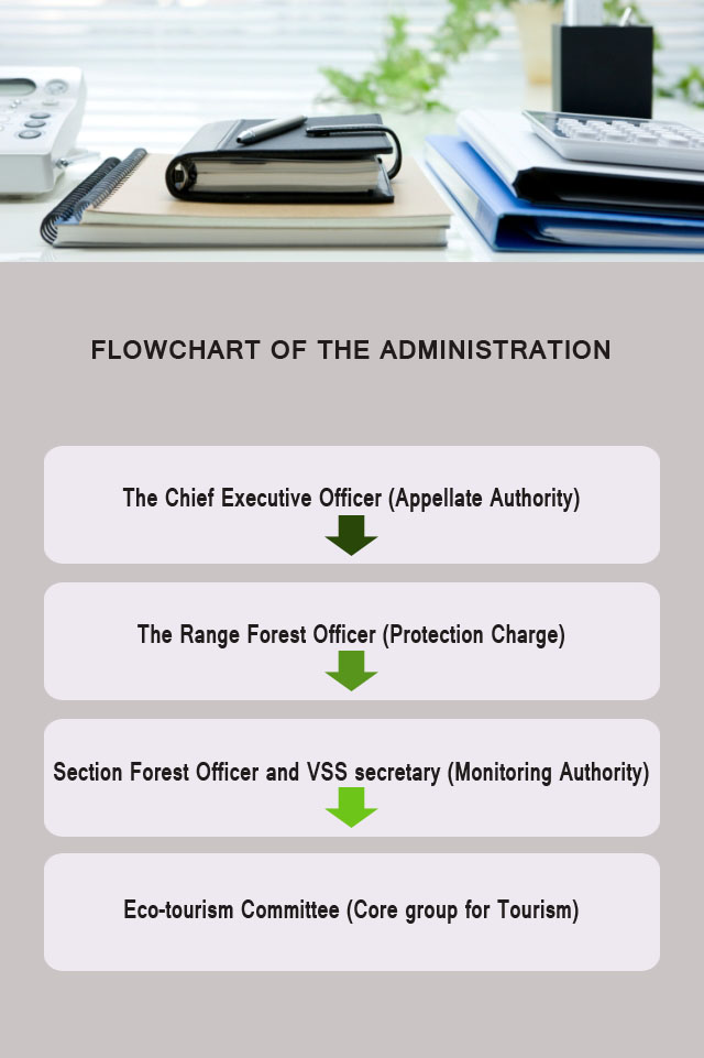 The secretaries of the concerned VSS will be in charge of the conduct the ecotourism programme and will be responsible for the entire activities pertaining to the programme. The Section Forest Officer under whose jurisdiction ecotourism programme carried out will monitor the activities of the programme and will be vigilant if those are being done as per Forest Laws.
